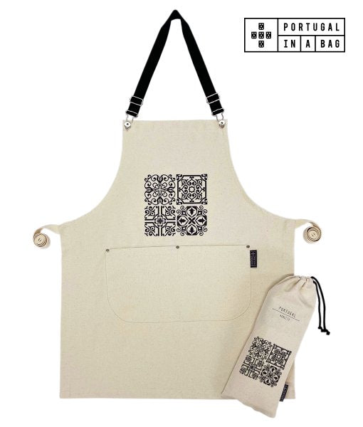 This cotton apron features traditional Portuguese tiles, a reflection of the country's rich history and art. Originally introduced by the Moors, these tiles adorned the walls of palaces, churches, and gardens. With scenes from history, everyday life, religion, and mythology, they add a touch of elegance to any kitchen.