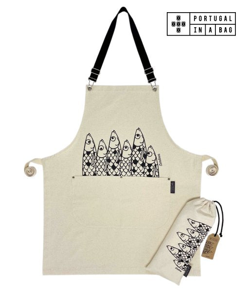 This apron in cotton features a historic print of sardines, a staple in Portuguese cuisine for centuries. As an important export during the Great War, sardines continue to play a prominent role in both Portuguese culinary traditions and global trade.