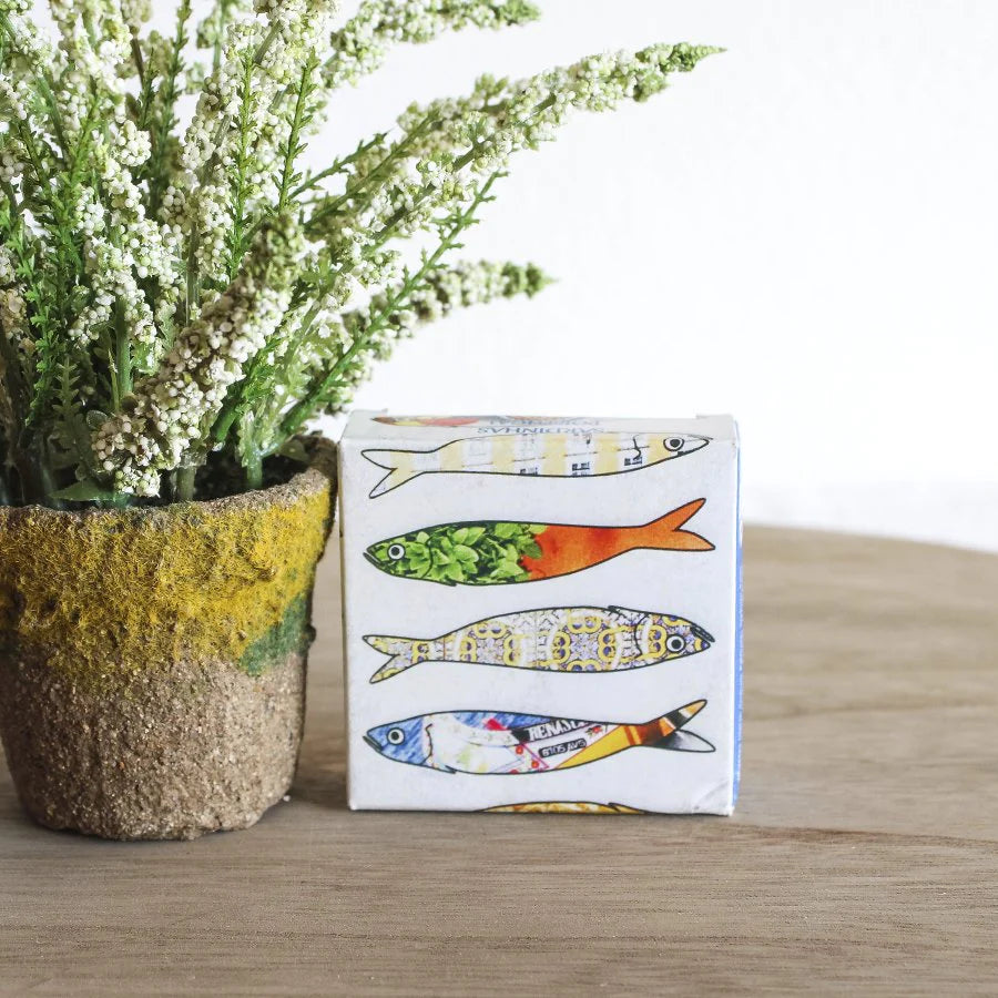 Apresentamos o sabonete “Sardinhas”, que faz parte da coleção Viver Portugal. Elaborado com eucalipto natural, este sabonete de 50gr incorpora a essência da cultura portuguesa. Mergulhe na história e nas tradições de Portugal em cada utilização.