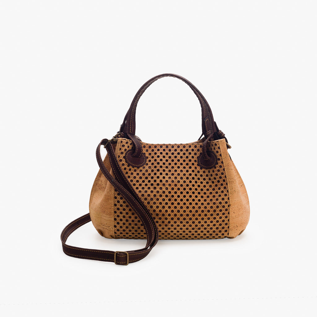 Expertly crafted with natural cork material, this handbag features a unique perforated design that adds a touch of elegance. The chocolate brown handles and adjustable strap offer comfortable carrying options. Made with ecological sustainability in mind, this handbag is perfect for the eco-conscious fashionista.