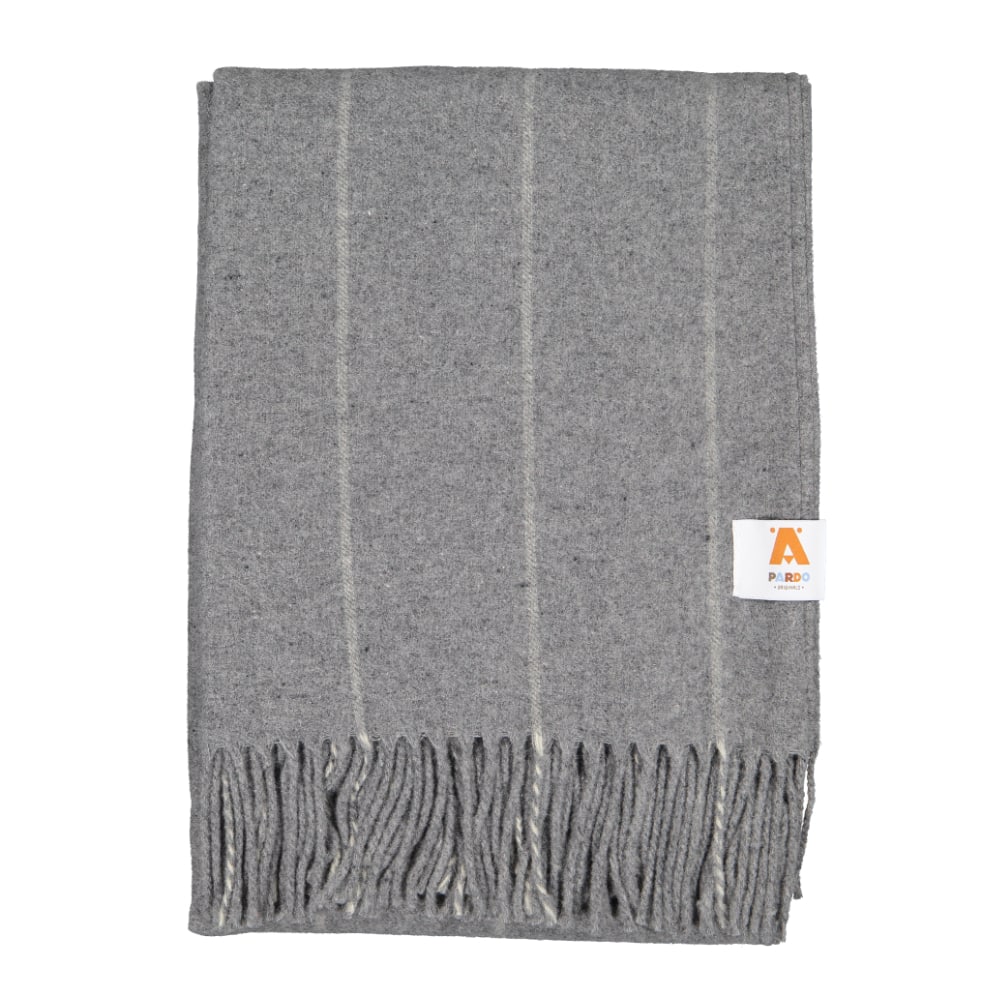 Our lambswool throws are light and warm, made from the wool of lambs' first shearing, which makes them incredibly soft, much like how baby hair is softer than adult hair. Perfect for cooler nights outdoors or for moments of comfort at home, these throws offer both lightness and coziness. This model features a modern pattern with vertical lines, combining classic shades of grey that are versatile and easy to match with any decor, whether in a modern or classic home. The grey color, sitting between black and white, provides simplicity and elegance.