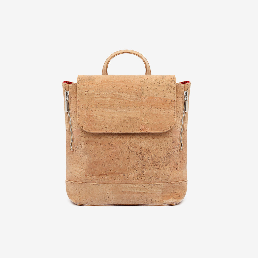 This backpack is made of natural cork and features a vibrant red lining and chrome hardware. Its sturdy construction and eco-friendly materials make it a durable and stylish option for carrying all of your essentials. Perfect for any adventure or daily commute.