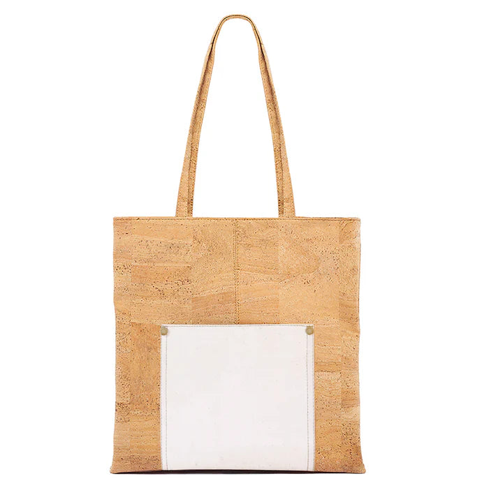 This natural cork shopping bag boasts a convenient pocket, making it perfect for carrying items on the go. Made from sustainable cork material, it is not only durable and eco-friendly, but also provides a unique and stylish option for your everyday needs.